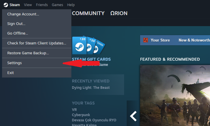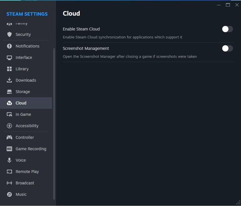 After logging into the account, click on the “Steam” text in the top left and go to the “Settings” option. (If the settings option is not visible, the account is in Family View mode. Right-click the game in the Library and select Properties. Disable the “Keep games saves in the Steam Cloud” option, then skip to step 6.)