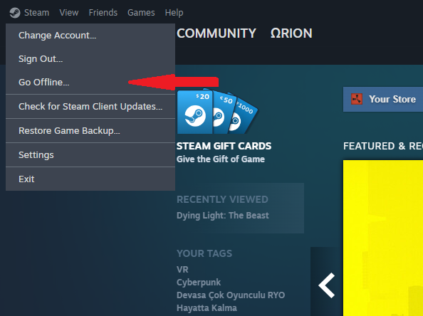 After the game has downloaded, launch it online once. Once you reach the main menu of the game, close it. Then click “Steam” in the top left again and select “Go Offline.”